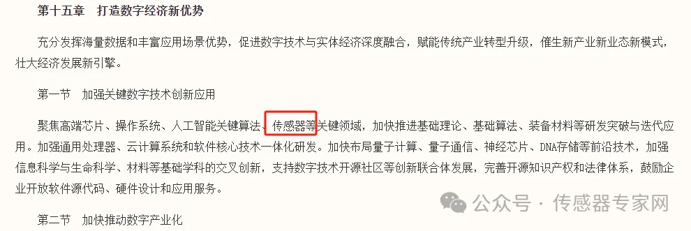同時,將傳感器與高端芯片、操作系統、人工智能關鍵算法等并列,作為我國建設數字經濟的關鍵領域。