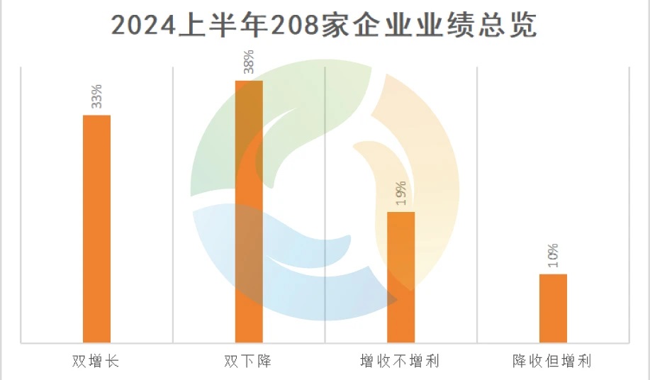 據統(tǒng)計,在已經發(fā)布2024年半年度報告的208家上市環(huán)保企業(yè)中,有80家企業(yè)呈現出“雙降”的情況,也就是營業(yè)總收入和凈利潤相較同期都有所下降。