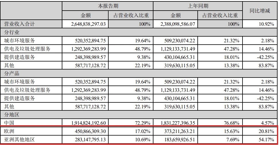 率先布局海外市場的中國環(huán)保企業(yè)已獲得的成果,也驗證了海外市場是當前非常廣闊的增量空間。根據中國天楹的半年度報告,海外業(yè)務占營業(yè)收入比重增幅已遠超國內業(yè)務,增長潛力值得期待。