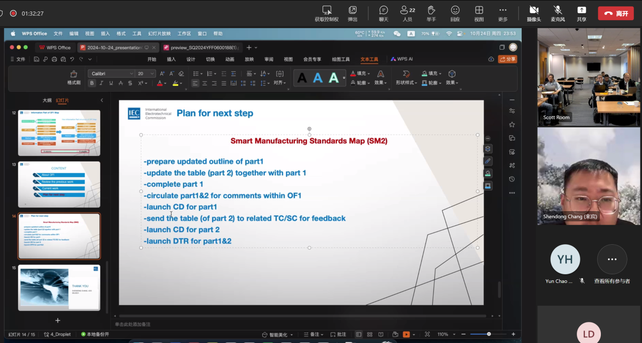 儀綜所常莘東工程師作為OF1“智能制造標(biāo)準(zhǔn)圖開放論壇組”聯(lián)合召集人,與德國專家Udo Bausch先生共同組織召開了工作組會(huì)議。會(huì)上主要介紹了ISO/IEC TR 63306《智能制造標(biāo)準(zhǔn)圖》系列標(biāo)準(zhǔn)的修訂背景,討論了第二版標(biāo)準(zhǔn)映射圖的主要維度。會(huì)議建議標(biāo)準(zhǔn)圖維度應(yīng)與ISO/IEC 62264《企業(yè)控制系統(tǒng)集成》、ISO/IEC 63339《智能制造統(tǒng)一參考模型》保持一致,并盡快啟動(dòng)修訂。