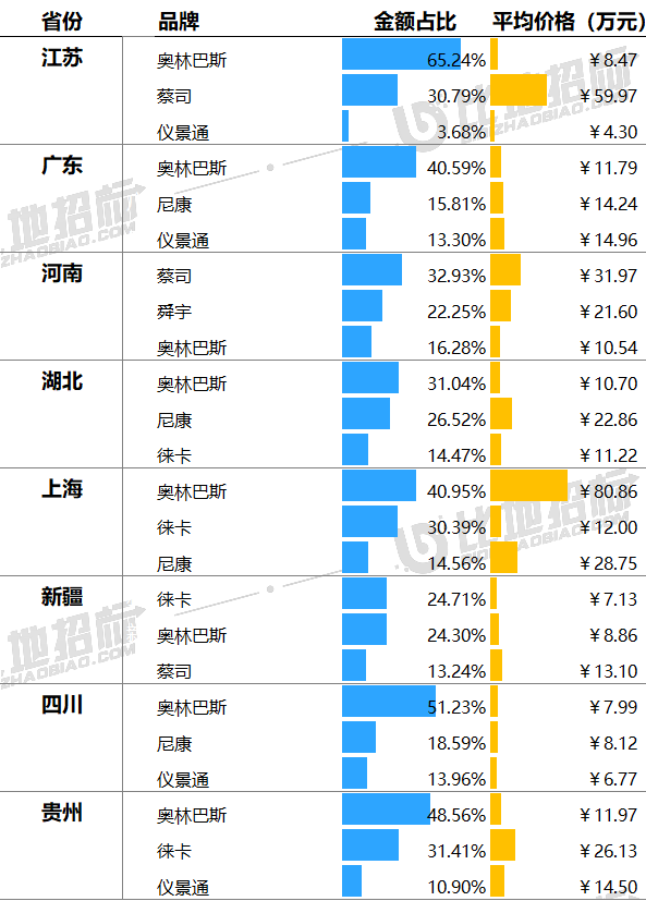 不同地區(qū)對(duì)品牌的偏好有所不同,江蘇偏好奧林巴斯、蔡司、儀景通;廣東偏好奧林巴斯、尼康、儀景通;河南偏好蔡司、舜宇、奧林巴斯等。