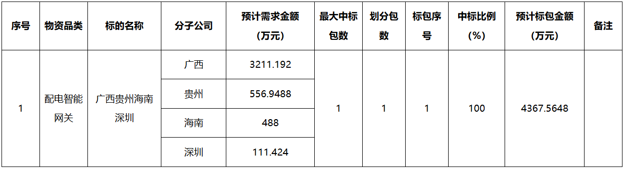 2.2招標(biāo)范圍:本次框架招標(biāo)范圍包括配電智能網(wǎng)關(guān),需求單位為廣西、貴州、海南電網(wǎng)公司和深圳供電局。