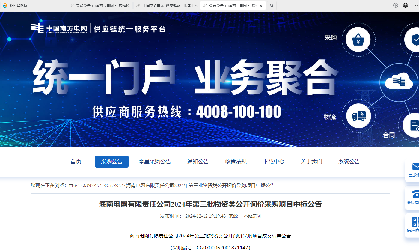 海南電網(wǎng)有限責(zé)任公司2024年第三批物資類公開詢價(jià)采購(gòu)項(xiàng)目成交結(jié)果公告(采購(gòu)編號(hào):CG0700062001871147)