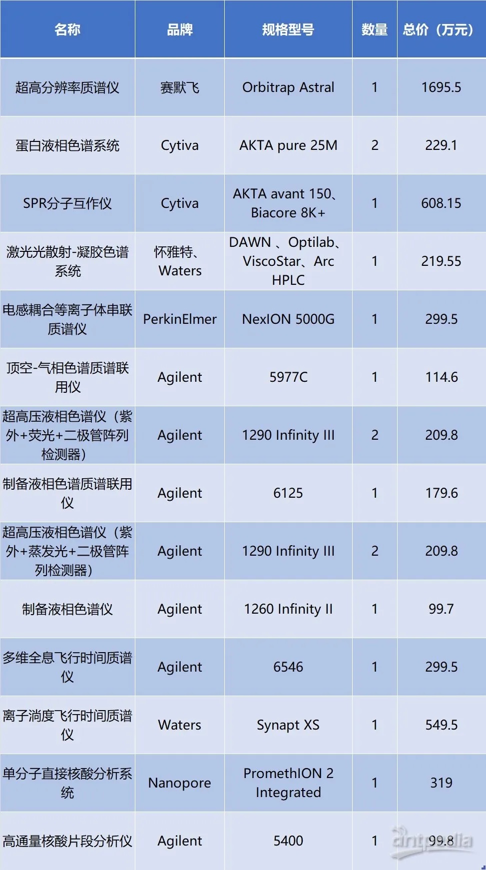 湖北中醫(yī)藥大學近日購置一批重大科研設(shè)備,其中,部分招標項目已經(jīng)開標。這些已開標的儀器設(shè)備包括超高分辨率質(zhì)譜儀、蛋白液相色譜系統(tǒng)、SPR分子互作儀、飛行時間質(zhì)譜儀等,中標的品牌有賽默飛、Cytiva、Waters、Agilent、PerkinElmer和Nanopore,此批次總中標(成交)金額為5133.1萬元。