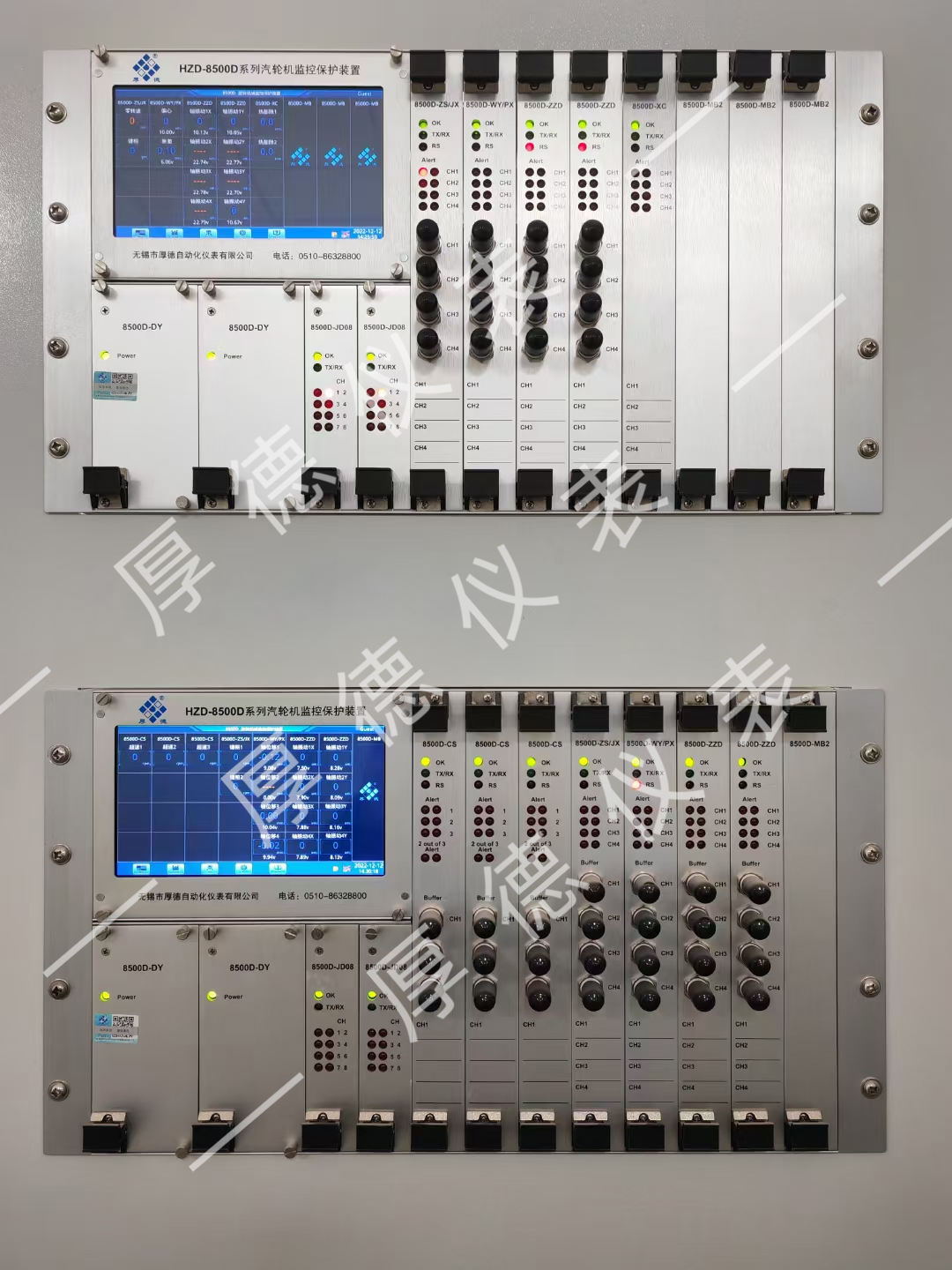 汽輪機是電力等行業(yè)的關(guān)鍵設備,一旦發(fā)生故障,造成的損失非常嚴重。汽輪機監(jiān)視系統(tǒng) (Turbine Supervisory Instruments,簡稱TSI)是用于在機組啟停和正常運行中進行實時監(jiān)測的保護系統(tǒng),并提供超限報警、停機保護等功能,對汽輪機組的安全運行起著重要的作用,已成為汽輪機組必不可少的關(guān)鍵設備之一。TSI系統(tǒng)可以被視為汽輪機的“心臟聽診器”,監(jiān)視著火電廠安全運行的每一次“跳動”。我公司研發(fā)生產(chǎn)的HZD-8500D系列汽輪機監(jiān)控保護裝置,主要用于測量汽輪機軸振、瓦振、偏心、轉(zhuǎn)速、位移和差脹等信號。其液晶屏上集中顯示各監(jiān)控模塊的組態(tài)參數(shù)、實時數(shù)據(jù)、趨勢曲線,集成了數(shù)據(jù)采集卡件,將傳感器信號直接采集成數(shù)字信號存儲并傳輸至后端處理設備,大大提高了設備監(jiān)測的數(shù)字化和智能化水平!