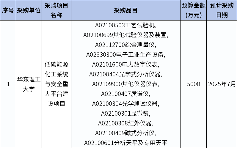 華東理工大學2025年7至12月政府采購意向,預算金額5000萬。