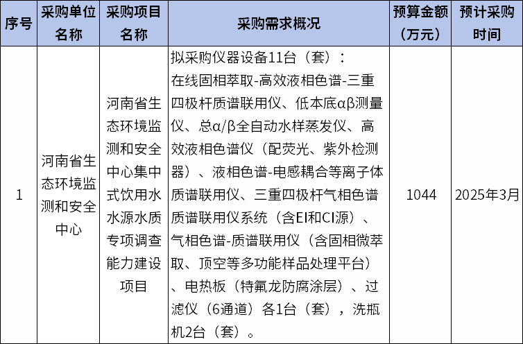 河南省生態(tài)環(huán)境監(jiān)測和安全中心集中式飲用水水源水質專項調查能力建設項目采購意向公開,擬采購儀器設備11臺(套),預算金額1044萬元。