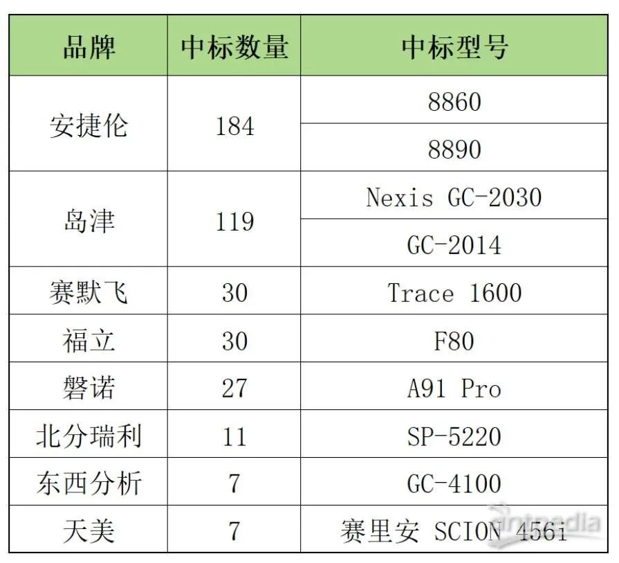 然而,令人矚目的是國(guó)產(chǎn)品牌的崛起,尤其是福立的氣相色譜儀,其中標(biāo)數(shù)量已經(jīng)與賽默飛齊平,共中標(biāo)30臺(tái)(套),占據(jù)了7%的市場(chǎng)份額,這一成績(jī)標(biāo)志著福立在技術(shù)與市場(chǎng)競(jìng)爭(zhēng)力上已經(jīng)與國(guó)際品牌并駕齊驅(qū)。此外,磐諾也表現(xiàn)出色,共中標(biāo)27臺(tái)(套)氣相色譜儀,占據(jù)6%的份額。