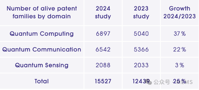 2024年,量子計算和量子通信領域的專利族占比明顯高于量子傳感,三者的占比分別為44%、42%14%。從2023年~2024年的增長率來看,量子計算和量子通信領域的專利增長也顯著高于量子傳感領域,三者的增長率分別為37%、22%3%。反映了當前全球量子技術領域的發展熱點和重點方向。