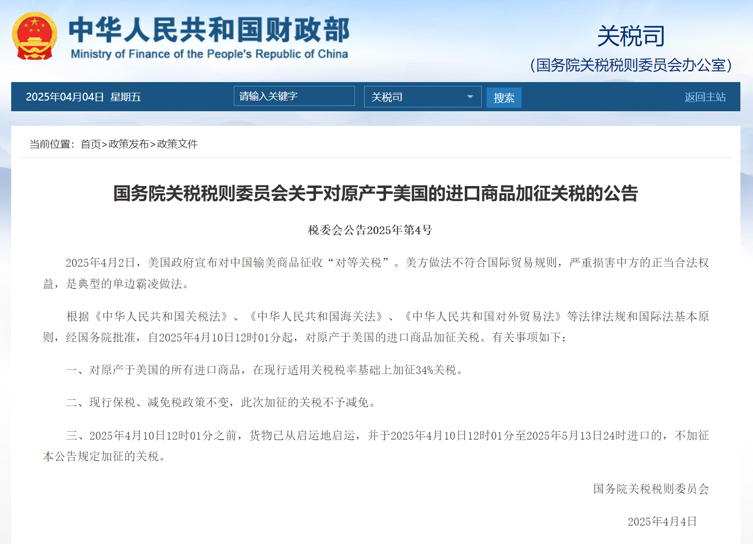4月2日,美國(guó)政府宣布對(duì)所有貿(mào)易伙伴加征“對(duì)等關(guān)稅”,對(duì)中國(guó)商品加征稅率高達(dá)34%;4月4日,中國(guó)國(guó)務(wù)院關(guān)稅稅則委員會(huì)發(fā)布公告,自4月10日起對(duì)原產(chǎn)于美國(guó)的所有進(jìn)口商品同等加征34%關(guān)稅。