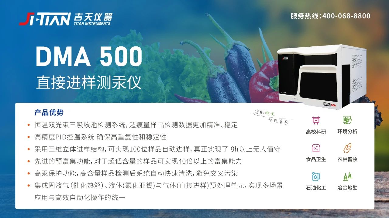 DMA-500直接進樣測汞儀是吉天儀器自主研發的第二代直接進樣元素分析產品,適用于各類型固體、液體、氣體樣品中的汞含量分析檢測。吉天儀器突破關鍵技術壁壘,逐步打破核心部件對進口的依賴,產品國產化率超85%