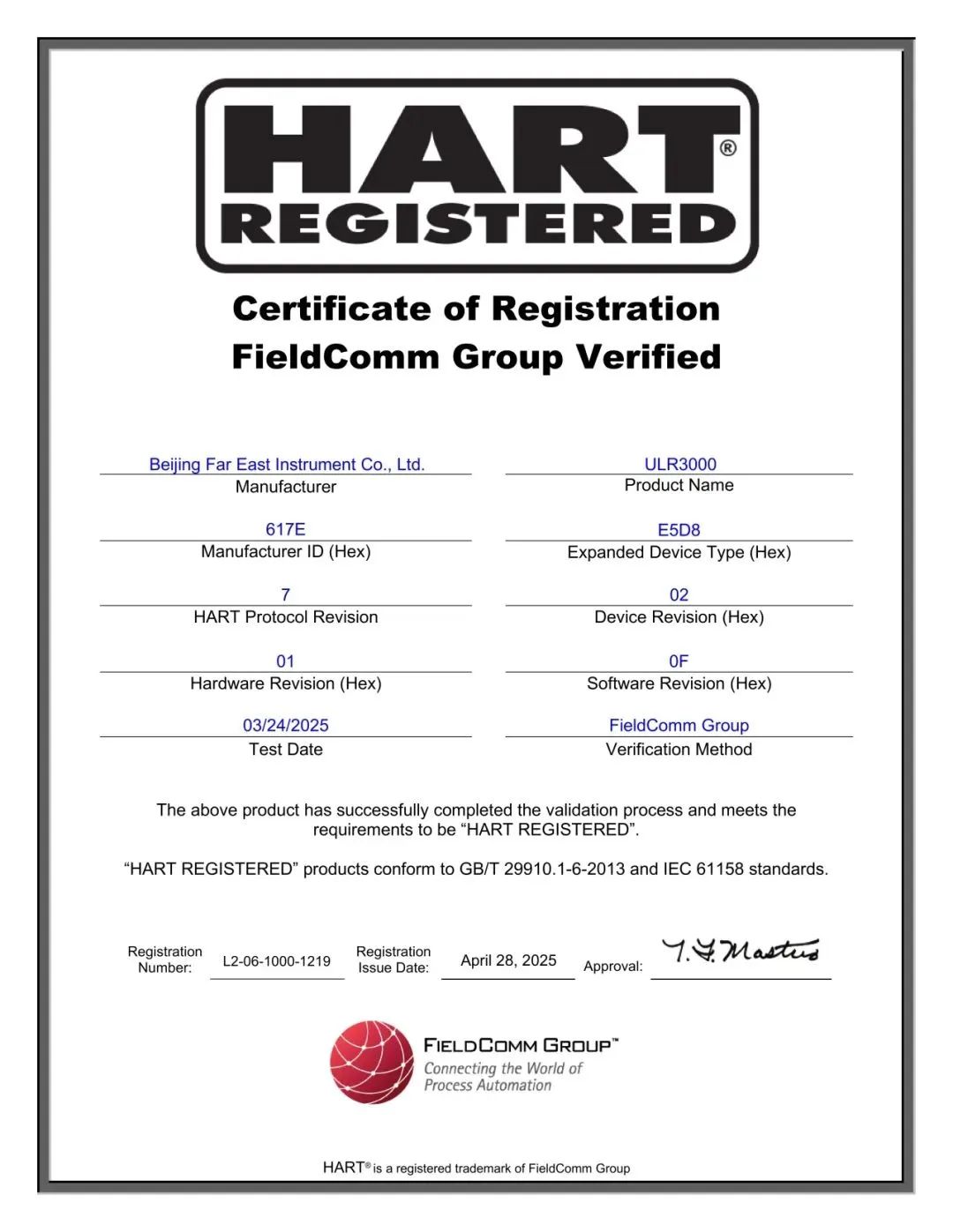 近日,遠(yuǎn)東儀表公司自主研發(fā)的ULR3000連續(xù)調(diào)頻雷達(dá)物位計(jì)正式通過國(guó)際權(quán)威機(jī)構(gòu) Field Comm GroupHART® 7通信協(xié)議認(rèn)證(注冊(cè)號(hào):L2-06-1000-1219),并嚴(yán)格符合 GB/T 29910.1-6-2013IEC 61158國(guó)際標(biāo)準(zhǔn),標(biāo)志著該產(chǎn)品在技術(shù)性能、通信兼容性及標(biāo)準(zhǔn)化水平上達(dá)到國(guó)際領(lǐng)先水準(zhǔn)。