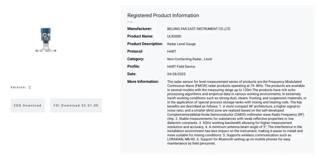 遠(yuǎn)東儀表ULR3000雷達(dá)物位計(jì)通過HART認(rèn)證