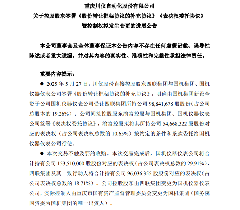 5月27日晚間,川儀股份(603100)公告,5月27日,公司直接控股股東四聯(lián)集團(tuán)與國機(jī)集團(tuán)、國機(jī)儀器儀表公司簽署《股份轉(zhuǎn)讓框架協(xié)議的補(bǔ)充協(xié)議》,明確由國機(jī)集團(tuán)新設(shè)全資子公司國機(jī)儀器儀表公司受讓四聯(lián)集團(tuán)所持公司98,841,678股股份(占公司總股本的19.26%);公司間接控股股東渝富控股與國機(jī)集團(tuán)、國機(jī)儀器儀表公司簽署《表決權(quán)委托協(xié)議》,渝富控股擬將其所持公司54,668,322股股份對(duì)應(yīng)的表決權(quán)(占公司表決權(quán)總數(shù)的10.65%)按約定的條件和條款委托給國機(jī)儀器儀表公司行使。