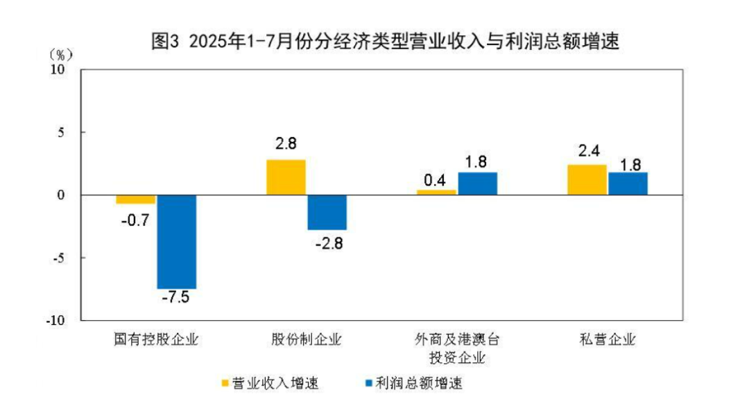 1—7月份,規模以上工業企業中,國有控股企業實現利潤總額12823.4億元,同比下降7.5%;股份制企業實現利潤總額29742.5億元,下降2.8%;外商及港澳臺投資企業實現利潤總額10216.7億元,增長1.8%;私營企業實現利潤總額11183.7億元,增長1.8%。1—7月份,采礦業實現利潤總額4930.9億元,同比下降31.6%;制造業實現利潤總額30235.8億元,增長4.8%;電力、熱力、燃氣及水生產和供應業實現利潤總額5036.8億元,增長3.9%。