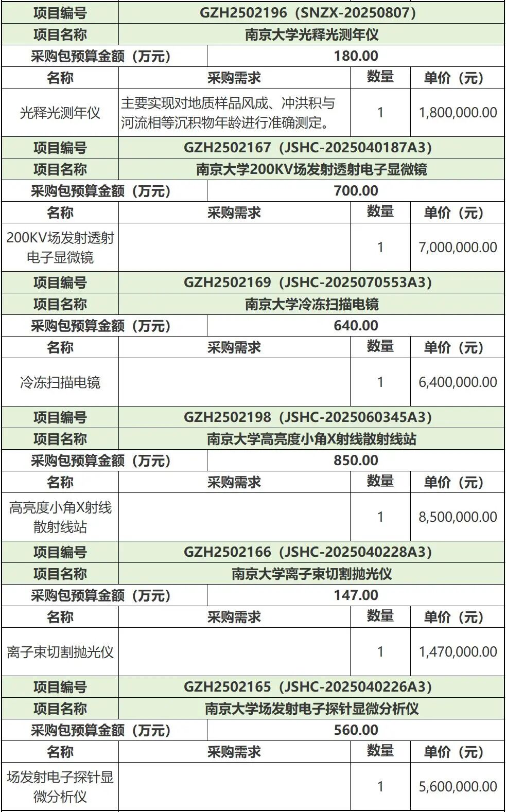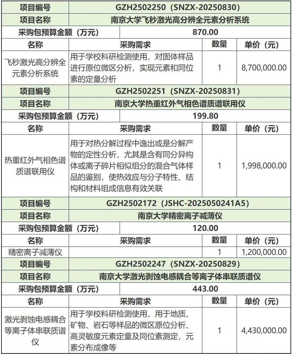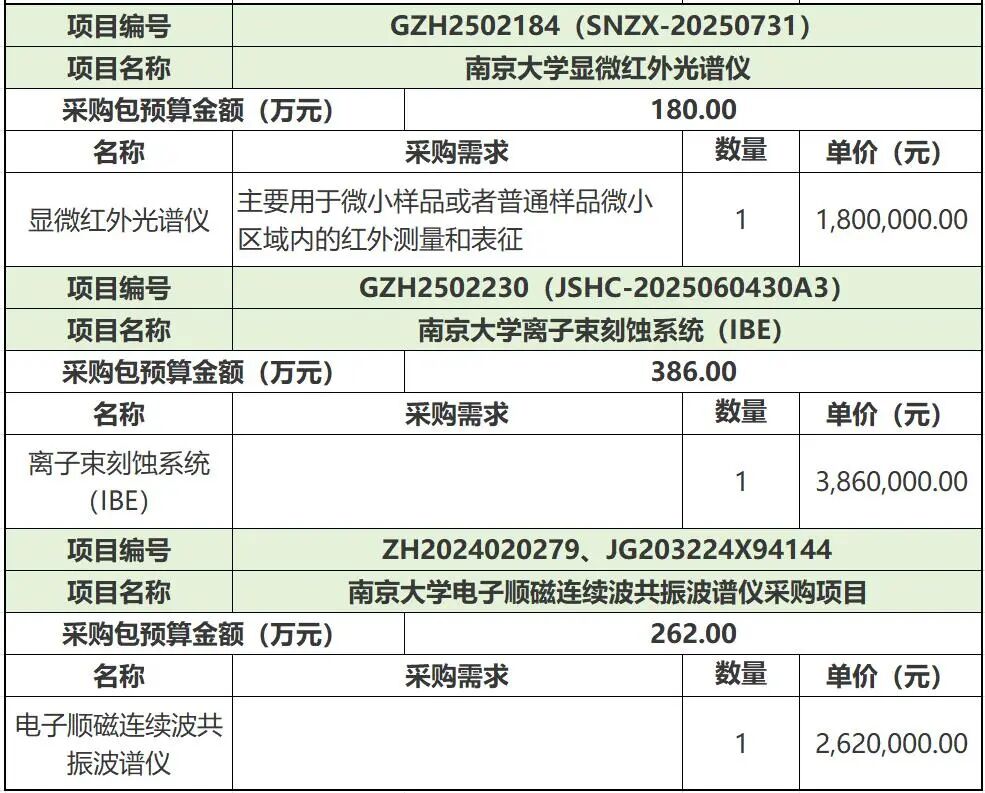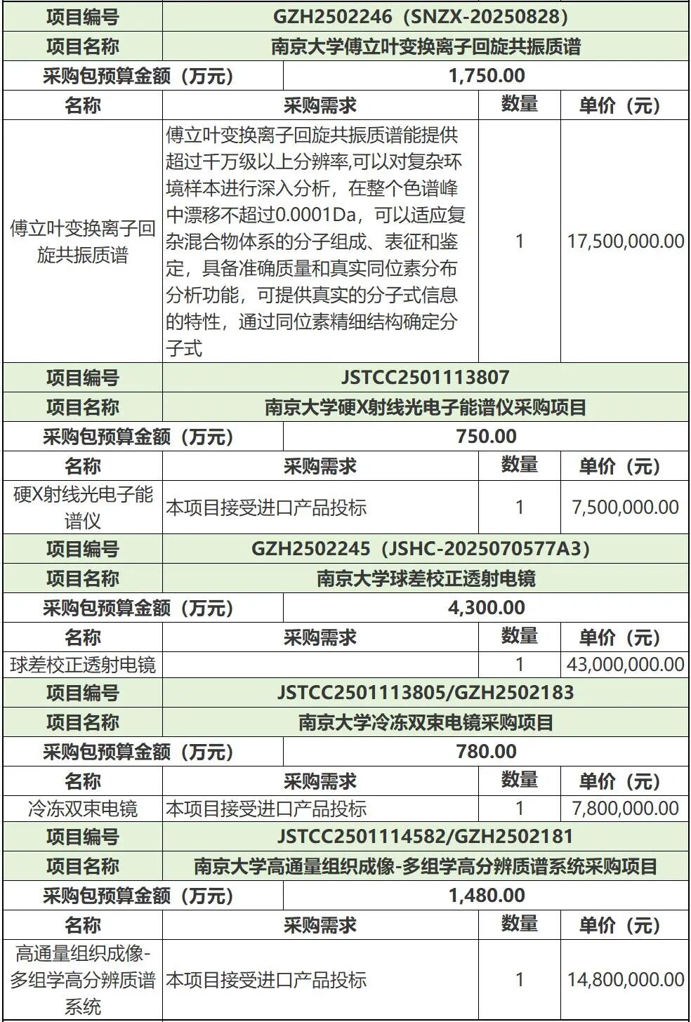 近日,南京大學多個科研儀器設備招標項目發(fā)布,采購包括激光剝蝕電感耦合等離子體串聯(lián)質譜儀、球差校正透射電鏡、冷凍雙束電鏡、飛秒激光高分辨全元素分析系統(tǒng),熱重紅外氣相色譜質譜聯(lián)用儀、傅立葉變換離子回旋共振質譜、硬X射線光電子能譜儀、高通量組織成像-多組學高分辨質譜系統(tǒng)、場發(fā)射電子探針顯微分析儀、顯微紅外光譜儀等,總采購金額超1.45億元。