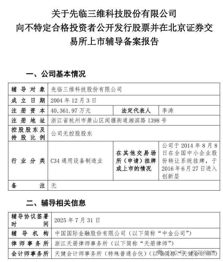 2025年7月31日,先臨三維與中國國際金融股份有限公司(“中金公司”)簽訂輔導協(xié)議,正式啟動IPO進程。
