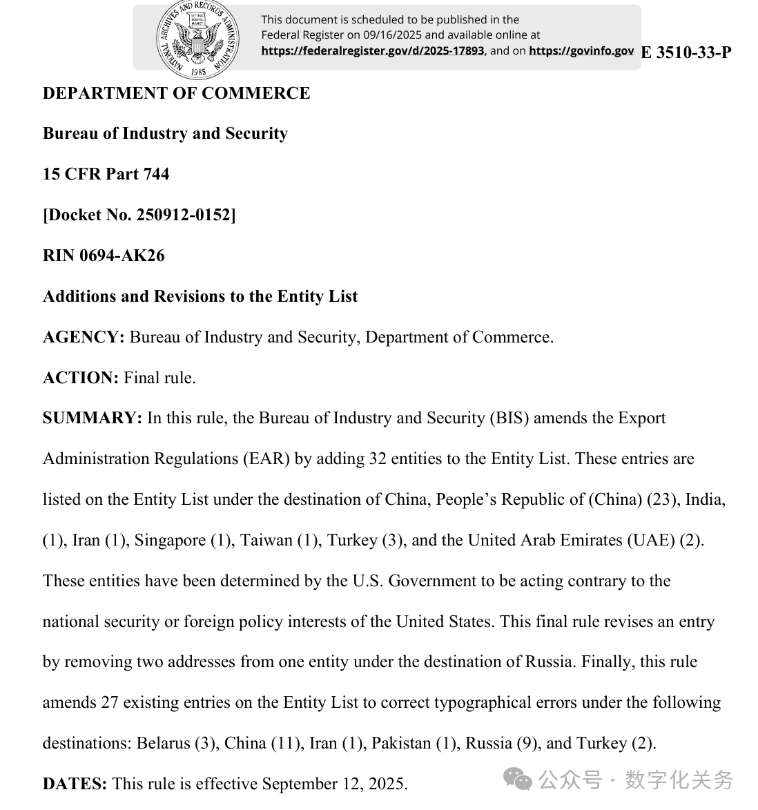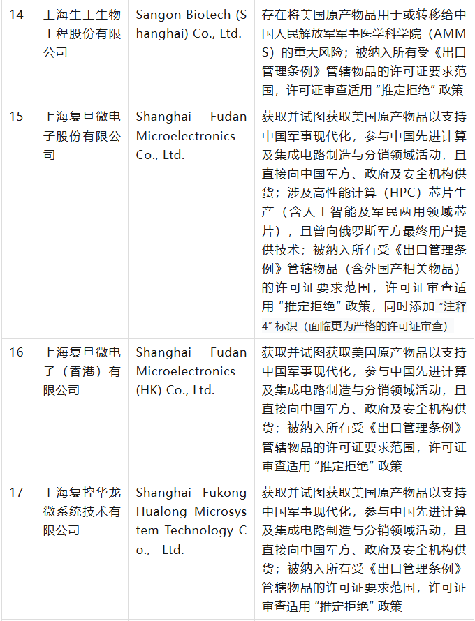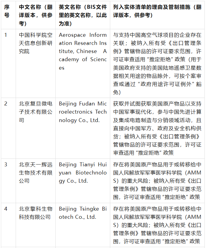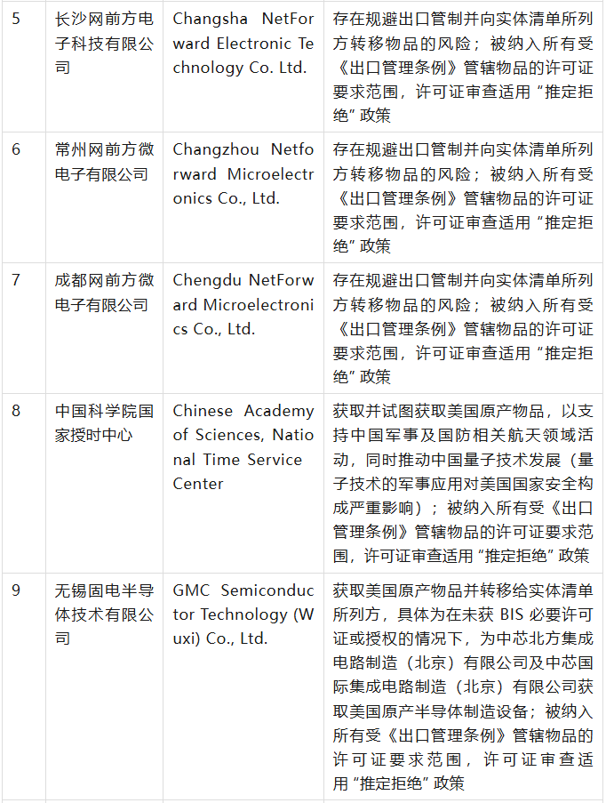 美國商務(wù)部工業(yè)與安全局(BIS)于9月12日在美國聯(lián)邦公報(bào)發(fā)布公告,通過修訂《出口管理?xiàng)l例》(EAR),將 32 家實(shí)體新增至實(shí)體清單,其中有23家是中國公司,具體清單、列入實(shí)體清單的理由及管制措施如下表(表中提及的列入實(shí)體清單的理由為BIS方面指認(rèn),不代表本號對該理由或相關(guān)事實(shí)的認(rèn)可):