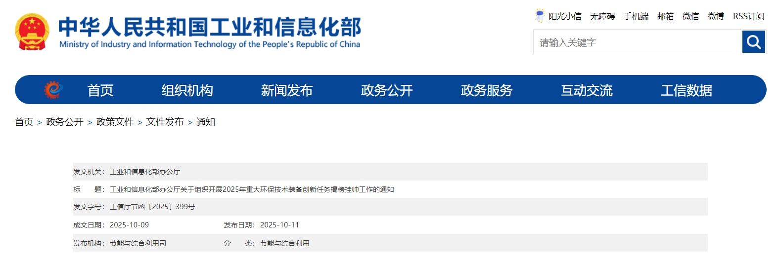 關(guān)于組織開展2025年重大環(huán)保技術(shù)裝備創(chuàng)新任務(wù)揭榜掛帥工作的通知