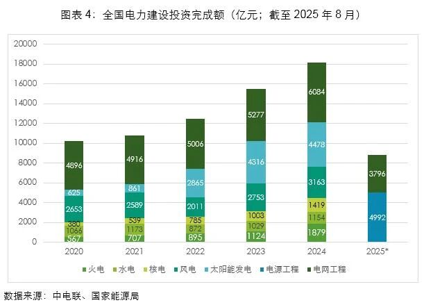 “十四五”我國電力建設(shè)投資保持快速增長,2020年突破1萬億元,2024年超1.8萬億元,2025年1-8月電源及電網(wǎng)投資同比均進一步增長。其中,火電投資增長速度同樣迅猛,從2020年的567億元,到2023年的1124億元已接近翻倍,再到2024年的1879億元又有67%的大幅增長。