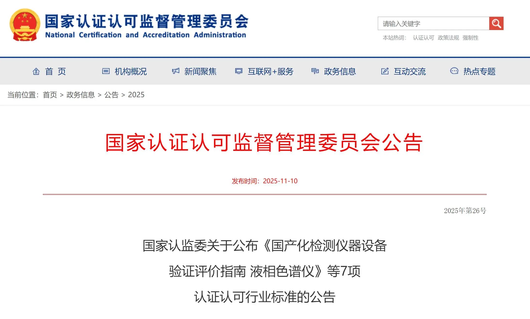 《國產(chǎn)化檢測儀器設(shè)備驗(yàn)證評價(jià)指南 液相色譜儀》等7項(xiàng)認(rèn)證認(rèn)可行業(yè)標(biāo)準(zhǔn)已經(jīng)國家認(rèn)監(jiān)委審核,現(xiàn)予公告。
