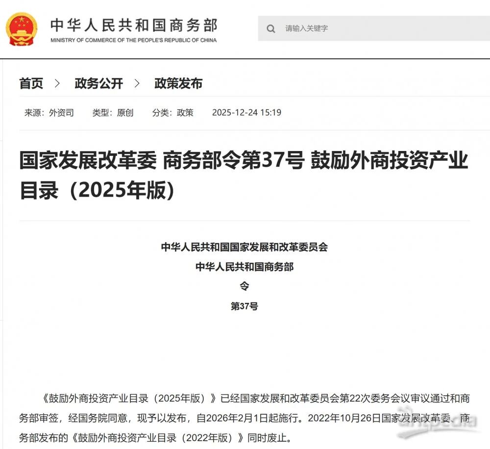 近日,經(jīng)國務院同意,國家發(fā)展改革委、商務部全文發(fā)布《鼓勵外商投資產(chǎn)業(yè)目錄(2025年版)》(以下簡稱《鼓勵目錄》),自2026年2月1日起施行。