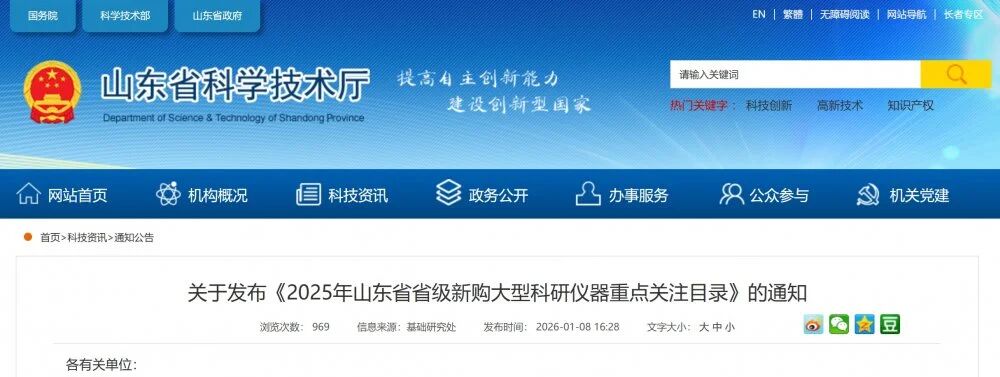 近日,山東省科學技術廳、山東省教育廳依托省大型科研儀器開放共享服務網數據,組織專家進行分析論證,對原值 50 萬元及以上大型科研儀器保有量、購置年限、使用績效、共享情況等核心指標進行定量分析與綜合研判,編制了《2025 年山東省省級新購大型科研儀器重點關注目錄》,X射線衍射儀、電感耦合等離子體發射光譜儀、電感耦合等離子體質譜儀、氣相色譜儀、液相色譜儀、流式細胞儀、激光共聚焦顯微鏡、超高速離心機、熒光定量PCR儀等9類儀器入選重點關注儀器。
