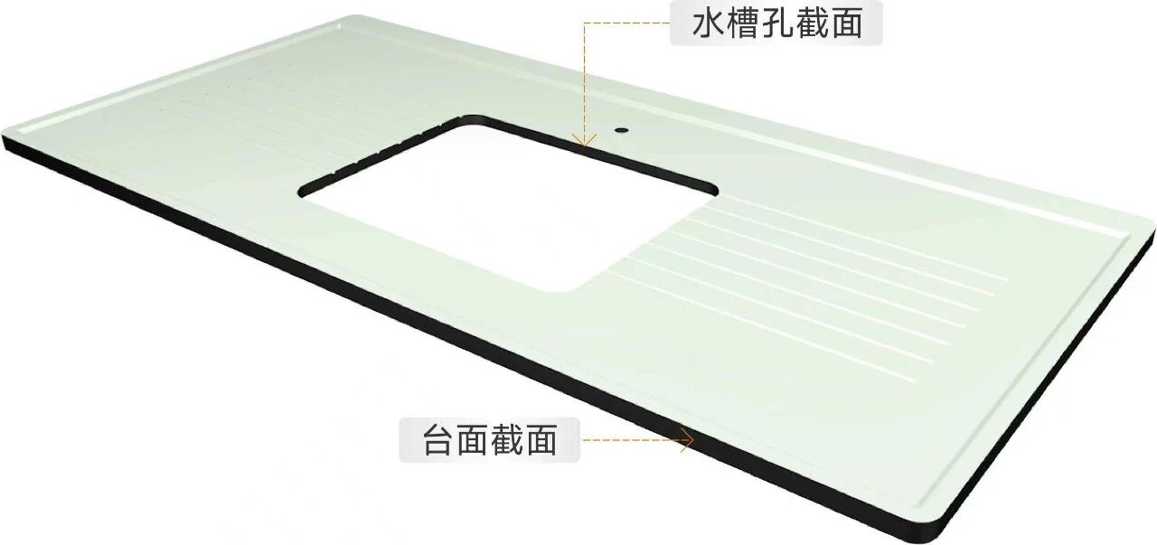 第九代-歐標陶瓷臺面可見截面及水槽孔截面全新升級一體成型釉面,適用于水槽臺及通風(fēng)柜臺面。