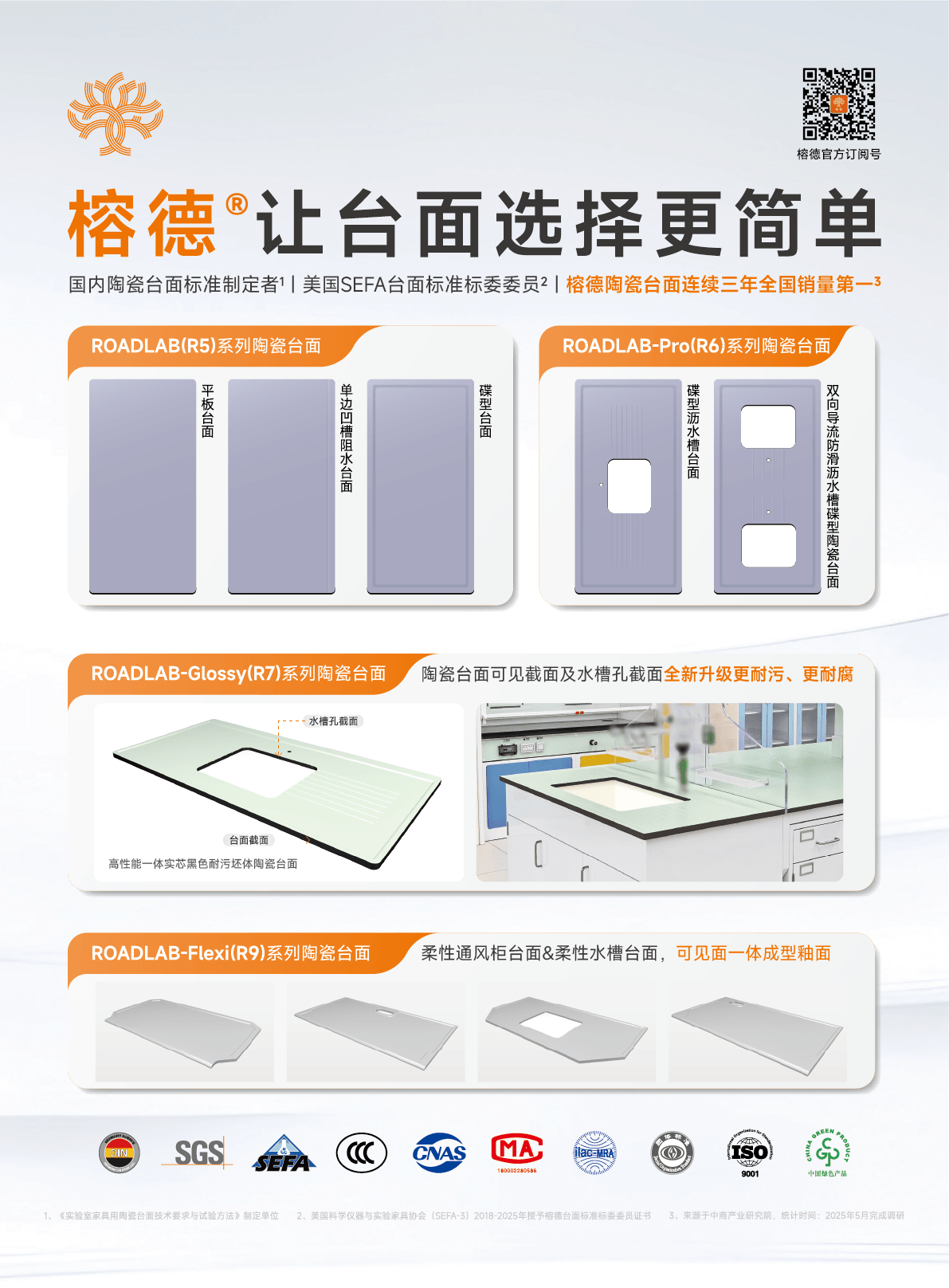 2025年推出的第七代(R7系列)高性能一體實芯黑色耐污坯體陶瓷臺面,針對陶瓷臺面可見截面及水槽孔截面全新升級,在耐污、耐腐蝕等關(guān)鍵性能上表現(xiàn)卓越,為全球科研空間提供了更優(yōu)質(zhì)的解決方案。