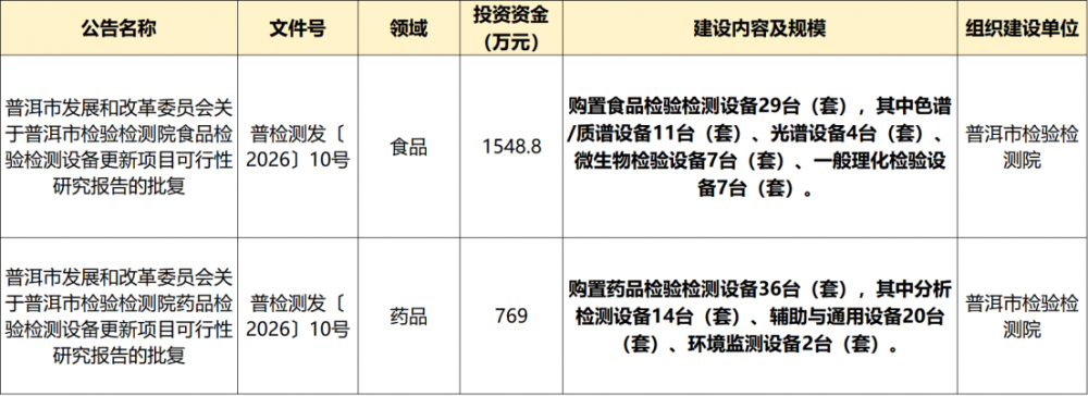 近日,普洱市發展和改革委員會正式批復普洱市檢驗檢測院食品、藥品兩大領域檢驗檢測設備更新項目可行性研究報告,兩個項目總投資達2317.8萬元,將通過超長期特別國債與單位自籌相結合的方式,全面提升區域食品藥品檢驗檢測技術水平,筑牢民生安全底線。