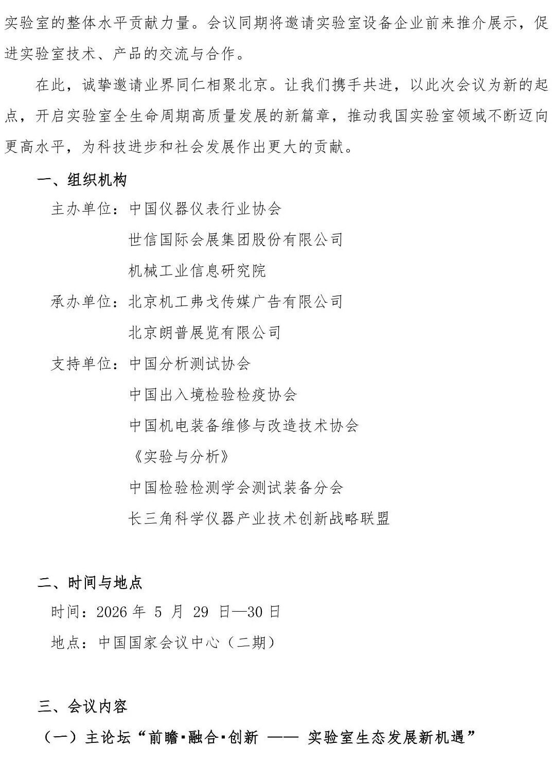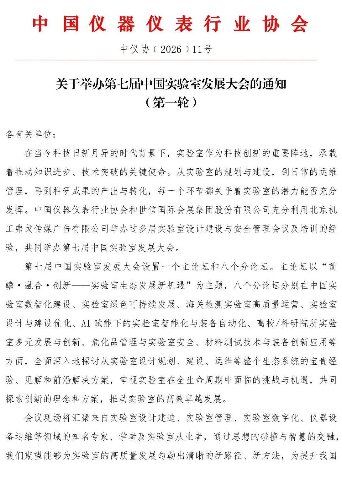 在當(dāng)今科技日新月異的時代背景下,實驗室作為科技創(chuàng)新的重要陣地,承載著推動知識進(jìn)步、技術(shù)突破的關(guān)鍵使命。從實驗室的規(guī)劃與建設(shè),到日常的運維管理,再到科研成果的產(chǎn)出與轉(zhuǎn)化,每一個環(huán)節(jié)都關(guān)乎著實驗室的潛力能否充分發(fā)揮。由中國儀器儀表行業(yè)協(xié)會和世信國際會展集團股主辦的第七屆中國實驗室發(fā)展大會將于2026年5月29-30日在國家會議中心二期舉辦!誠摯邀請業(yè)界同仁相聚北京,共襄盛舉!