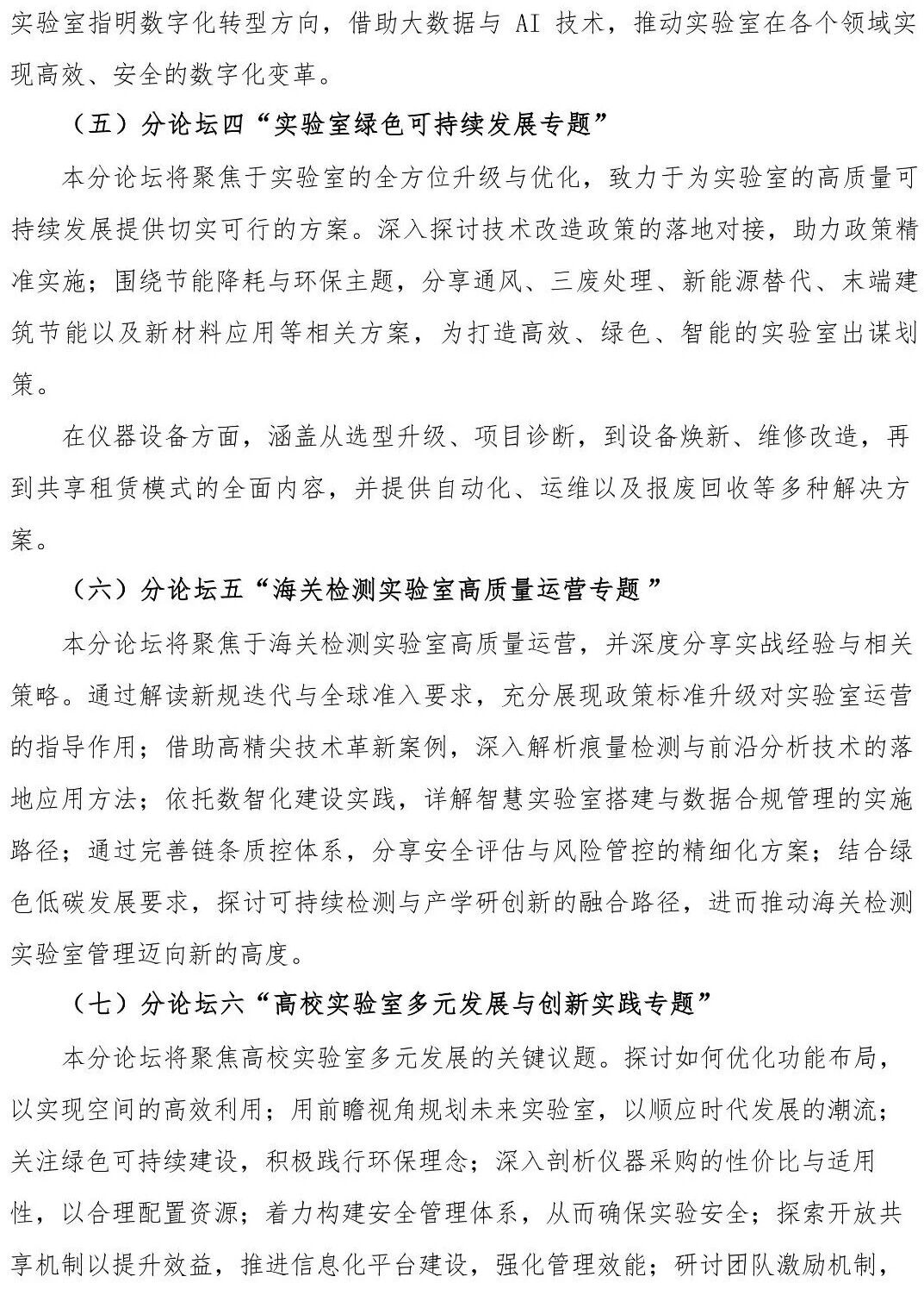第七屆中國實驗室發(fā)展大會設(shè)置一個主論壇和八個分論壇。主論壇以“前瞻・融合・創(chuàng)新——實驗室生態(tài)發(fā)展新機遇”為主題,八個分論壇分別在實驗室綠色可持續(xù)發(fā)展、海關(guān)檢測實驗室高質(zhì)量運營、實驗室設(shè)計建設(shè)與優(yōu)化、AI賦能下的實驗室智能化與裝備自動化、高校/科研院所實驗室多元發(fā)展與創(chuàng)新、?;饭芾砼c實驗室安全、中國實驗室數(shù)智化建設(shè)、材料測試技術(shù)與裝備創(chuàng)新應(yīng)用等方面,全面深入地探討從實驗室設(shè)計規(guī)劃、建設(shè)、運維等整個生態(tài)系統(tǒng)的寶貴經(jīng)驗、見解和前沿解決方案,審視實驗室在全生命周期中面臨的挑戰(zhàn)與機遇,共同探索創(chuàng)新的理念和方案,推動實驗室的高效卓越發(fā)展。