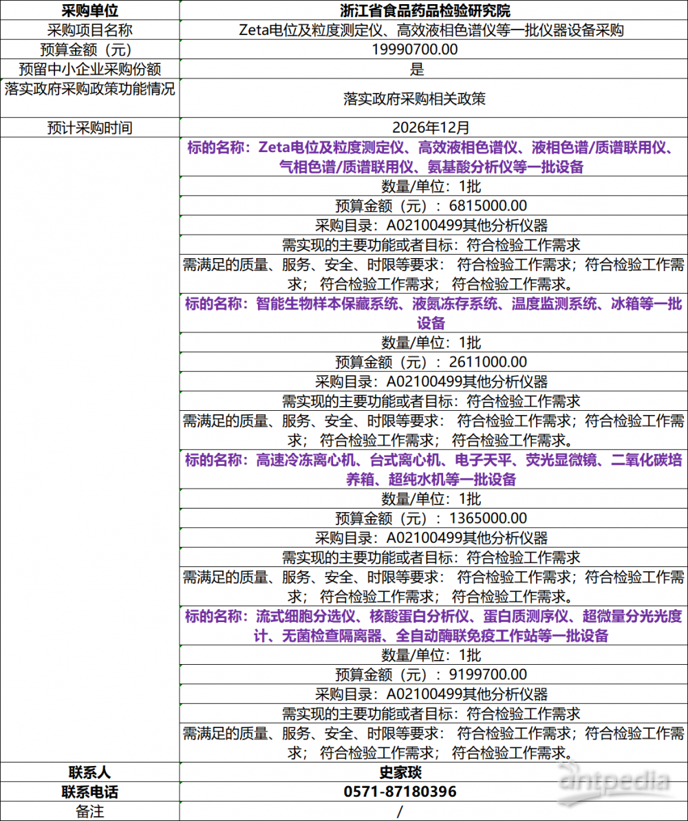 423日,浙江食藥檢院發布20266月至12月政府采購意向,擬采購AI菌落計數儀、激光粒度分析儀、X射線衍射儀、動物房專用空調機組等一批儀器設備,預算金額為822.01萬元。